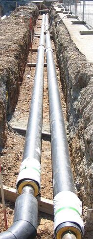 After generation, the heat is distributed to the customer via a network of insulated pipes. District heating systems consist of feed and return lines. Usually the pipes are installed underground but there are also systems with overground pipes. The DH system's start-up and shut downs, as well as fluctuations on heat demand and ambient temperature, induce thermal and mechanical cycling on the pipes due to the thermal expansion. The axial expansion of the pipes is partially counteracted by frictional forces acting between the ground and the casing, with the shear stresses transferred through the PU foam bond. Therefore, the use of pre-insulated pipes has simplyfied the laying methods, employing cold laying instead of expansion facilities like compensators or U-bends, being so more cost effective.[50] Pre-insulated pipes sandwich assembly composed of a steel heat service pipe, an insulating layer (polyurethane foam) and a polyethylene (PE) casing, which are bonded by the insulating material.[51] While polyurethane has outstanding mechanical and thermal properties, the high toxicity of the diisocyanates required for its manufacturing has caused a restriction on their use.[52] This has triggered research on alternative insulating foam fitting the application,[53] which include polyethylene terephthalate (PET) [54] and polybutylene (PB-1).[55]