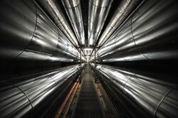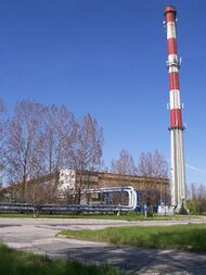 The heat production comes mostly from natural gas and biomass sources, and 54% of the heat in district heating is generated through cogeneration.[108] The distribution system consists of 2800 km of pipes. Warm and hot water are the most common heat carriers, but older high-pressure steam transport still accounts for around one-quarter of the primary distribution, which results in more losses in the system.[110]