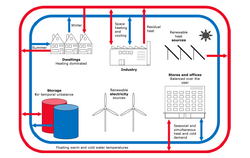 While network piping for ambient ground temperature networks is less expensive to install per pipe diameter than in earlier generations, as it does not need the same degree of insulation for the piping circuits, it has to be kept in mind that the lower temperature difference of the pipe network leads to significantly larger pipe diameters than in prior generations. Due to the requirement of each connected building in the fifth generation district heating and cooling systems to have their own heat pump the system can be used both as a heat source or a heat sink for the heat pump, depending on if it is operated in a heating and cooling mode. As with prior generations the pipe network is an infrastructure that in principle provides an open access for various low temperature heat sources, such as ambient heat, ambient water from rivers, lakes, sea, or lagoons, and waste heat from industrial or commercial sources.[14]
