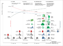 Compared to the previous generations the temperature levels have been reduced to increase the energy efficiency of the system, with supply side temperatures of 70 °C and lower. Potential heat sources are waste heat from industry, CHP plants burning waste, biomass power plants, geothermal and solar thermal energy (central solar heating), large scale heat pumps, waste heat from cooling purposes and data centers and other sustainable energy sources. With those energy sources and large scale thermal energy storage, including seasonal thermal energy storage, fourth generation district heating systems are expected to provide flexibility for balancing wind and solar power generation, for example by using heat pumps to integrate surplus electric power as heat when there is much wind energy or providing electricity from biomass plants when back-up power is needed.[7] Therefore, large scale heat pumps are regarded as a key technology for smart energy systems with high shares of renewable energy up to 100% and advanced fourth generation district heating systems.[10][7][11]