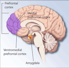 The amygdalocentric model of PTSD proposes that the amygdala is very much aroused and insufficiently controlled by the medial prefrontal cortex and the hippocampus, in particular during extinction.[105] This is consistent with an interpretation of PTSD as a syndrome of deficient extinction ability.[105][106]