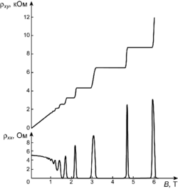 The quantum Hall effect was discovered by Klaus von Klitzing, Dorda and Pepper in 1980 when they observed the Hall conductance to be integer multiples of a fundamental constant [math]\displaystyle{ e^2/h }[/math].(see figure) The effect was observed to be independent of parameters such as system size and impurities.[38] In 1981, theorist Robert Laughlin proposed a theory explaining the unanticipated precision of the integral plateau. It also implied that the Hall conductance is proportional to a topological invariant, called Chern number, whose relevance for the band structure of solids was formulated by David J. Thouless and collaborators.[40][41]:69, 74 Shortly after, in 1982, Horst Störmer and Daniel Tsui observed the fractional quantum Hall effect where the conductance was now a rational multiple of the constant [math]\displaystyle{ e^2/h }[/math]. Laughlin, in 1983, realized that this was a consequence of quasiparticle interaction in the Hall states and formulated a variational method solution, named the Laughlin wavefunction.[42] The study of topological properties of the fractional Hall effect remains an active field of research.[43] Decades later, the aforementioned topological band theory advanced by David J. Thouless and collaborators[44] was further expanded leading to the discovery of topological insulators.[45][46]