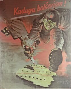 Communists were among the first people targeted by the Nazis, with Dachau concentration camp when it first opened being for the holding of communists, leading socialists and other "enemies of the state" in 1933.[41] Among the motivations for the Holocaust, the systematic extermination of the Jewish people, was the belief shared both by the Nazis and by the German army that Jews were responsible for Communism ("Bolshevism"), which they perceived as a threat to the "Western Civilization"; thus, extermination of the Jewry, the alleged racial root of Communism, was justified as a part of anti-Communist struggle. The understanding of "Bolshevism" as a Jewish conspiracy originated in the interwar period, during which the right-wing propaganda spread antisemitism through the so-called "Stab-in-the-back myth" which blamed the Jews for the defeat of Germany in World War I and for the 1918 Revolution. The identification of "Bolshevism" with the Jewry became generally accepted in Nazi Germany, and during World War II, the extermination of the Jews as a war against communism and Nazi mass killings were justified even by the army commanders who did not share the ideology of Nazism. More to it, the Jewry was identified with the anti-Fascist partisan movements in the occupied territories, and the extermination of the Jews was justified as measures of counterinsurgency and self-defense against an armed enemy.[42]