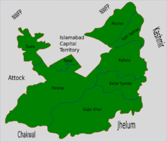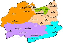 ![]() From top, left to right: Rawal Lake, Gulshan Dadan Khan Mosque, Bahria Town, Rawat Fort, Christ Church, Rawalpindi Railway Station | |