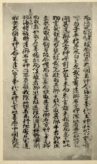 In the early 8th century, the Emperor Tenmu commissioned a compilation of the legends and genealogies of Japan's clans, resulting in the completion of the Kojiki in 712. Designed to legitimate the ruling dynasty, this text created a fixed version of various stories previously circulating in oral tradition.[268] The Kojiki omits any reference to Buddhism,[269] in part because it sought to ignore foreign influences and emphasise a narrative stressing indigenous elements of Japanese culture.[270] Several years later, the Nihon shoki was written. Unlike the Kojiki, this made various references to Buddhism,[269] and was aimed at a foreign audience.[271] Both of these texts sought to establish the imperial clan's descent from the sun kami Amaterasu,[269] although there were many differences in the cosmogonic narrative they provided.[272] Quickly, the Nihon shoki eclipsed the Kojiki in terms of its influence.[271] Other texts written at this time also drew on oral traditions regarding the kami. The Sendari kuji hongi for example was probably composed by the Mononobe clan while the Kogoshui was probably put together for the Imbe clan, and in both cases they were designed to highlight the divine origins of these respective lineages.[273] A government order in 713 called on each region to produce fudoki, records of local geography, products, and stories, with the latter revealing more traditions about the kami which were present at this time.({{{1}}}, {{{2}}})