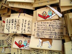 A common feature of Shinto shrines is the provision of ema, small wooden plaques onto which practitioners will write a wish or desire that they would like to see fulfilled. The practitioner's message is written on one side of the plaque, while on the other is usually a printed picture or pattern related to the shrine itself.[208] Ema are provided both at Shinto shrines and Buddhist temples in Japan;[154] unlike most amulets, which are taken away from the shrine, the ema are typically left there as a message for the resident kami.[148] Those administering the shrine will then often burn all of the collected ema at new year.[148]