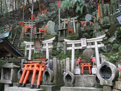 Although some kami are venerated only in a single location, others have shrines across many areas.[60] Hachiman for instance has around 25,000 shrines dedicated to him,[47] while Inari has 40,000.[61] The act of establishing a new shrine to a kami who already has one is called bunrei ("dividing the spirit").({{{1}}}, {{{2}}}) As part of this, the kami is invited to enter a new place, with the instalment ceremony known as a kanjo.[60] The new, subsidiary shrine is known as a bunsha.({{{1}}}, {{{2}}}) Individual kami are not believed to have their power diminished by their residence in multiple locations, and there is no limit on the number of places a kami can be enshrined.[60] In some periods, fees were charged for the right to enshrine a particular kami in a new place.[60] Shrines are not necessarily always designed as permanent structures.[3]
