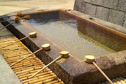 Shinto rituals begin with a process of purification, or harae.({{{1}}}, {{{2}}}) Using fresh water or salt water, this is known as misogi.[86] At shrines, this entails sprinkling this water onto the face and hands, a procedure known as temizu,[185] using a font known as a temizuya.[186] Another form of purification at the start of a Shinto rite entails waving a white paper streamer or wand known as the haraigushi.({{{1}}}, {{{2}}}) When not in use, the haraigushi is usually kept in a stand.[185] The priest waves the haraigushi horizontally over a person or object being purified in a movement known as sa-yu-sa ("left-right-left").[185] Sometimes, instead of a haraigushi, the purification is carried out with an o-nusa, a branch of evergreen to which strips of paper have been attached.[185] The waving of the haraigushi is often followed by an additional act of purification, the shubatsu, in which the priest sprinkles water, salt, or brine over those assembled from a wooden box called the 'en-to-oke or magemono.[187]