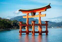 Shrine entrances are marked by a two-post gateway with either one or two crossbeams atop it, known as torii.({{{1}}}, {{{2}}}) The exact details of these torii varies and there are at least twenty different styles.({{{1}}}, {{{2}}}) These are regarded as demarcating the area where the kami resides;[19] passing under them is often viewed as a form of purification.[134] More broadly, torii are internationally recognised symbols of Japan.[19] Their architectural form is distinctly Japanese, although the decision to paint most of them in vermillion reflects a Chinese influence dating from the Nara period.[135] Also set at the entrances to many shrines are komainu, statues of lion or dog like animals perceived to scare off malevolent spirits;({{{1}}}, {{{2}}}) typically these will come as a pair, one with its mouth open, the other with its mouth closed.[136]