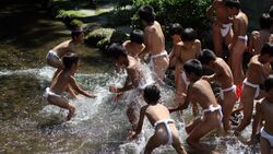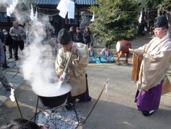A purification ceremony known as misogi involves the use of fresh water, salt water, or salt to remove kegare.[86] Full immersion in the sea is often regarded as the most ancient and efficacious form of purification.[87] This act links with the mythological tale in which Izanagi immersed himself in the sea to purify himself after discovering his deceased wife; it was from this act that other kami sprang from his body.({{{1}}}, {{{2}}}) An alternative is immersion beneath a waterfall.({{{1}}}, {{{2}}}) Salt is often regarded as a purifying substance;({{{1}}}, {{{2}}}) some Shinto practitioners will for instance sprinkle salt on themselves after a funeral,({{{1}}}, {{{2}}}) while those running restaurants may put a small pile of salt outside before business commences each day.[88] Fire, also, is perceived as a source of purification.[89] The yaku-barai is a form of harae designed to prevent misfortune,[90] while the oharae, or "ceremony of great purification", is often used for end-of-year purification rites, and is conducted twice a year at many shrines.[91] Before the Meiji period, rites of purification were generally performed by onmyōji, a type of diviner whose practices derived from the Chinese yin and yang philosophy.[92]