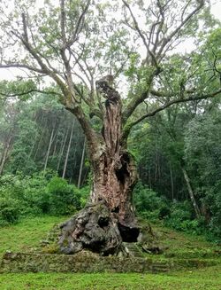 In Japan, kami have been venerated since prehistory.[3] During the Yayoi period they were regarded as being formless and invisible,[49] later coming to be depicted anthropomorphically under Buddhist influence.({{{1}}}, {{{2}}}) Now, statues of the kami are known as shinzo.[50] Kami are usually associated with a specific place, often a prominent landscape feature such as a waterfall, mountain, large rock, or distinctive tree.({{{1}}}, {{{2}}}) Physical objects or places in which the kami are believed to have a presence are termed shintai;[51] objects inhabited by the kami that are placed in the shrine are known as go-shintai.({{{1}}}, {{{2}}}) Objects commonly chosen for this purpose include mirrors, swords, stones, beads, and inscribed tablets.({{{1}}}, {{{2}}}) These go-shintai are concealed from the view of visitors,({{{1}}}, {{{2}}}) and may be hidden inside boxes so that even the priests do not know what they look like.[51]