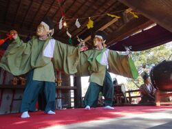 There are two broad types of kagura.[223] One is Imperial kagura, also known as mikagura. This style was developed in the imperial court and is still performed on imperial grounds every December.[224] It is also performed at the Imperial harvest festival and at major shrines such as Ise, Kamo, and Iwashimizu Hachiman-gū. It is performed by singers and musicians using shakubyoshi wooden clappers, a hichiriki, a kagura-bue flute, and a six-stringed zither.[128] The other main type is sato-kagura, descended from mikagura and performed at shrines across Japan. Depending on the style, it is performed by miko or by actors wearing masks to portray various mythological figures.[225] These actors are accompanied by a hayashi band using flutes and drums.[128] There are also other, regional types of kagura.[128]