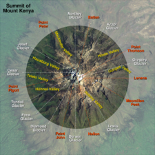 The remaining names are after well-known Kenyan personalities, with the exception of John and Peter, which were named by the missionary Arthur after two disciples. Pigott was the Acting Administrator of Imperial British East Africa at the time of Gregory's expedition, and there is a group of four peaks to the east of the main peaks named after governors of Kenya and early settlers; Coryndon, Grigg, Delamere and McMillan.[8]