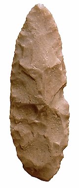 Specialized projectile weapons as well have been found at various sites in Middle Stone Age Africa, including bone and stone arrowheads at South African sites such as Sibudu Cave (along with an early bone needle also found at Sibudu) dating approximately 60,000-70,000 years ago,[19][20][21][22][23] and bone harpoons at the Central African site of Katanda dating to about 90,000 years ago.[24] Evidence also exists for the systematic heat treating of silcrete stone to increase its flake-ability for the purpose of toolmaking, beginning approximately 164,000 years ago at the South African site of Pinnacle Point and becoming common there for the creation of microlithic tools at about 72,000 years ago.[25][26] Early stone-tipped projectile weapons (a characteristic tool of Homo sapiens), the stone tips of javelins or throwing spears, were discovered in 2013 at the Ethiopian site of Gademotta, and date to around 279,000 years ago.[27]