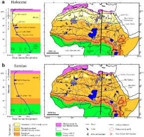 Vegetation and water bodies in early Holocene (top), between about 12,000 and 7,000 years ago, and Eemian (bottom)