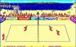 The player can play as Sinjin Smith and Randy Stoklos. The game features three modes of play: practice, match play and tournament. In the latter, you progress through five beaches (San Diego, Chicago , Waikiki, Rio de Janeiro, and Australia ) filled with increasingly challenging opponents as you attempt to win it all. While Smith and Stoklos are joined by Ron Von Hagen, Tim Hovland and Mike Dodd as the only 'real' volleyball players featured in the game, EA spiced up the competition with some notorious characters from other games, including Hard Hat Mack and Lester from Skate or Die and Ski or Die.
