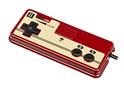 The original model Famicom features two game controllers, both of which are hardwired to the back of the console.[lower-alpha 10] The second controller lacks the START and SELECT button, featuring a small microphone instead; however, few games use this feature.[107] The earliest produced Famicom units have square A and B buttons;[100] issues with them getting stuck when pressed down led Nintendo to change their shape to a circular design in subsequent units following the console's recall.[108][109]