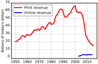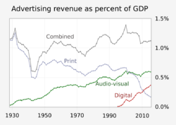 Worldwide spending on advertising in 2015 amounted to an estimated US$529.43billion.[4] Advertising's projected distribution for 2017 was 40.4% on TV, 33.3% on digital, 9% on newspapers, 6.9% on magazines, 5.8% on outdoor and 4.3% on radio.[5] Internationally, the largest ("Big Five") advertising agency groups are Omnicom, WPP, Publicis, Interpublic, and Dentsu.[6]