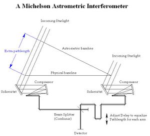 Interferometry is a technique pioneered by Albert A. Michelson in the 19th century.[43] Optical interferometry, which has matured within the last two decades, combines the light of multiple telescopes so that precise measurements can be made, akin to what might be accomplished with a single, much larger telescope.[44] It is the interaction of light waves, called interference, that makes this possible. Interference can be used to cancel out the glare of bright stars or to measure distances and angles accurately.[44] The construction of the word partially illustrates this: interfere + measure = interfer-o-metry.[44] At radio wavelengths of the electromagnetic spectrum, interferometry has been used for more than 50 years to measure the structure of distant galaxies.[44]