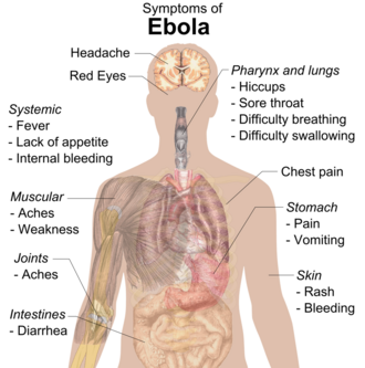 Ebola virus disease (EVD), also known as Ebola hemorrhagic fever (EHF) or simply Ebola, is a viral hemorrhagic fever of humans and other primates caused by ebolaviruses.[1] Signs and symptoms typically start between two days and three weeks after contracting the virus with a fever, sore throat, muscular pain, and headaches.[1]Vomiting, diarrhea and rash usually follow, along with decreased function of the liver and kidneys.[1] At this time, some people begin to bleed both internally and externally.[1] The disease has a high risk of death, killing 25% to 90% of those infected, with an average of about 50%.[1] This is often due to low blood pressure from fluid loss, and typically follows 6 to 16 days after symptoms appear.[2]