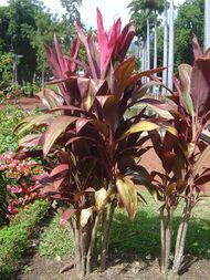 Ti (Cordyline fruticosa) is a palm-like plant growing up to 3 to 4 m (9.8 to 13.1 ft) tall with an attractive fan-like and spirally arranged cluster of broadly elongated leaves at the tip of the slender trunk. It has numerous color variations, ranging from plants with red leaves to green, yellow, and variegated cultivars. Its original native distribution is unknown, but it is believed to be native to the region from Bangladesh, to Mainland Southeast Asia, South China, Taiwan, Island Southeast Asia, New Guinea, and Northern Australia. It has the highest morphological diversity in New Guinea and is believed to have been extensively cultivated there. It is commonly misidentified as a "Dracaena", along with members of the genus Cordyline, due to past classification systems.[90][91]