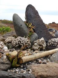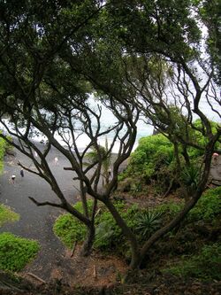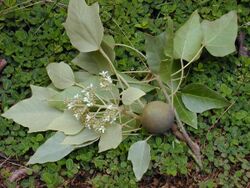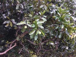 Mastwood (Calophyllum inophyllum) is a widespread timber tree native to tropical Asia. It is notable for its ability to grow to massive sizes in sandy or rocky beaches of island and coastal habitats, as well as its habit of sending out arching large trunks over the water where its seeds are dispersed via the currents.[47][48] Due to these characters, mastwood are of particular importance to traditional shipbuilding of the larger Austronesian outrigger ships and were carried with them as they migrated to Oceania and Madagascar.[48]