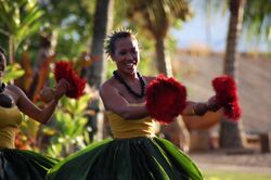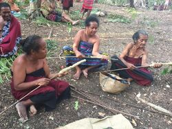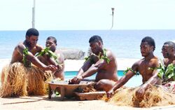 In Island Melanesia, ti are regarded as sacred by various Austronesian-speaking peoples and are used in rituals for protection, divination, and fertility.[94] Among the Kwaio people, red ti are associated with feuding and vengeance, while green ti are associated with ancestor spirits, markers of sacred groves, and wards against evil. The Kwaio cultivate these varieties around their communities.[123] Among the Maenge people of New Britain, ti leaves are worn as everyday skirts by women. The color and size of leaves can vary by personal preference and fashion. New cultivars with different colors are traded regularly and strands of ti are grown near the village. Red leaves can only worn by women past puberty. Ti is also the most important plant in magic and healing rituals of the Maenge. Some ti cultivars are associated with supernatural spirits and have names and folklore around them.[124] In Vanuatu, Cordyline leaves, known locally by the Bislama name nanggaria, are worn tucked into a belt in traditional dances like Māʻuluʻulu, with different varieties having particular symbolic meanings. Cordylines are often planted outside nakamal buildings.[125] In Fiji, red ti leaves are used as skirts for dancers and are used in rituals dedicated to the spirits of the dead. They are also planted around ceremonial buildings used for initiation rituals.[94]