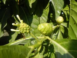 Noni (Morinda citrifolia) is native to Southeast Asia extending to New Guinea and northern Australia . It grows readily in beach and rocky environments. It has been introduced widely into the Pacific. All parts of the plant were used by Austronesians for traditional medicine and timber, but its most common traditional use is for the extraction of red or yellow dyes. The odor of the plant and the fruit was also traditionally believed to repel evil spirits. The fruit is also edible, but is usually only eaten as famine food.[156]