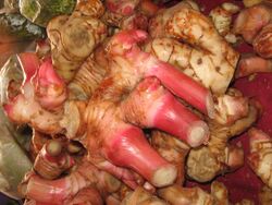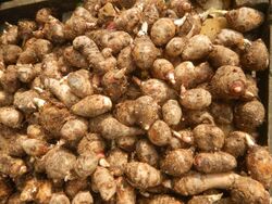 The lesser yam (Dioscorea esculenta) is the second most important yam crop among Austronesians. Like D. alata, it requires minimal processing, unlike the other more bitter yam species. However, it has smaller tubers than D. alata and is usually spiny.[144] Like D. alata it was introduced to Madagascar and the Comoros by Austronesians, where it spread to the East African coast.[145][133][146] They are also a dominant crop in Near Oceania, However, it did not reach to the furthest islands in Polynesia, being absent in Hawaii and New Zealand.[147][148][149]