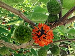 Numerous species of Artocarpus are traditionally cultivated or harvested from semi-domesticated or wild populations in Island Southeast Asia and Micronesia for food, timber, traditional medicine, and other uses. They include Artocarpus anisophyllus (entawak),[25] Artocarpus heterophyllus (jackfruit or nangka),[26] Artocarpus integer (cempedak),[27] Artocarpus lacucha (lakuch),[28] Artocarpus mariannensis (Marianas breadfruit),[29] Artocarpus odoratissimus (tarap or marang),[30] and Artocarpus treculianus (tipuho),[31] among many others. The most important species pertaining to the Austronesian expansion however, are Artocarpus camansi (breadnut or seeded breadfruit) and Artocarpus altilis (breadfruit).[32]
