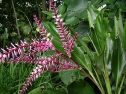 The lengkuas (Alpinia galanga) is native to Southeast Asia. Its original center of cultivation during the spice trade was Java, and today it is still cultivated extensively in Island Southeast Asia, most notably in the Greater Sunda Islands and the Philippines . It is valued for its use in food and for traditional medicine and is regarded as being superior to ginger. It has a pungent smell reminiscent of black pepper. The red and white cultivars are often used differently, with the red cultivars being primarily medicinal, and the white cultivars being primarily a spice.[146][210] Lengkuas is also the source of the leaves used to make nanel among the Kavalan people of Taiwan, a rolled leaf instrument used as a traditional children's toy common among Austronesian cultures.[211]