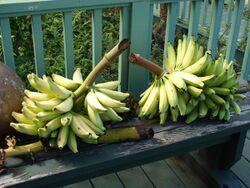 Fe'i bananas (Musa × troglodytarum), also spelled Fehi or Féi, are banana cultivars unique to Melanesia, the Maluku Islands, and Polynesia. Unlike other domesticated banana cultivars which are derived from Musa acuminata and Musa balbisiana, fe'i bananas are believed to be hybrids derived from entirely different species. Proposed progenitors of fe'i bananas include Musa jackeyi, Musa lolodensis, Musa maclayi, and Musa peekelii, all of which are native to New Guinea and surrounding islands. Like other bananas, they were spread eastwards to Polynesia for use as food. However, they are absent in Island Southeast Asia, reaching only as far as the Maluku Islands.[159]