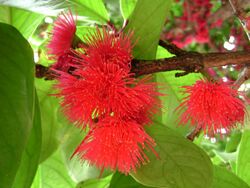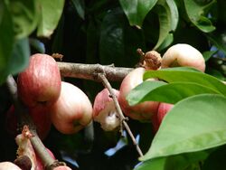 The mountain apple (Syzygium malaccense) along with the closely related species like the water apple (Syzygium aqueum) and the Java apple (Syzygium samarangense), are native throughout Island Southeast Asia and were cultivated since prehistory. They were all carried by Austronesians into the Pacific and planted deliberately.[9][200]