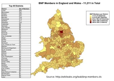 the BNP spent £75,000 on producing and delivering over a million leaflets across London; Barnbrook narrowly secured a seat on the Assembly, polling 130,714 votes (5%). In the FPTP constituency seat covering Barking and Dagenham, the BNP won 18,020 votes (10%). The BNP also slightly increased their average vote (14%) in contested local council seats that year, winning three seats on Stoke-on-Trent council and another in Epping Forest.[16] In November 2008, the entire 11,000 BNP membership list with names, addresses, telephone numbers and employment details was leaked on the internet.[40] Simon Darby,