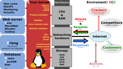 Both databases Mnesia and CouchDB as well as Yaws (and also Mochiweb, Misultin, and Cowboy) are written in Erlang, so web applications developed for LYME/LYCE may be run entirely in one Erlang virtual machine. This is in contrast to LAMP where the web server (Apache) and the application (written in PHP, Perl or Python) might be in the same process, but the database is always a separate process. As a result of using Erlang, LYME and LYCE applications perform well under high load[1] and if distribution and fault tolerance is needed.[2]