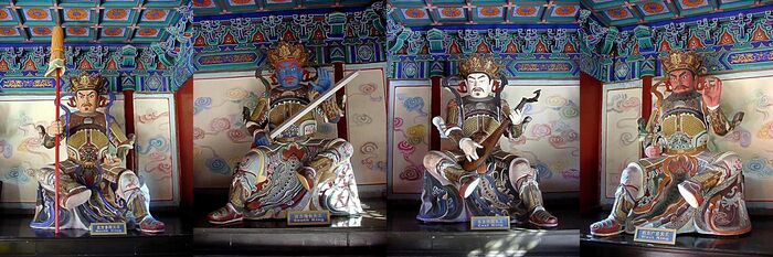 Jade Buddha Temple (Shanghai, China) - Statues of Yama (Yánmóluówáng) on the left, Saraswati (Biàncáitiān) in the center and Leigong on the right.