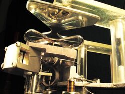 Typical construction is shown in the drawing. The pivoted sector NN is attracted to the fixed sector QQ. The moving sector is counterbalanced by the small weight w and indicates the voltage by the pointer P. In newer instruments the weight is replaced by a spring, thus allowing the meter to be used both in horizontal and vertical positions; this form is shown in the photograph. The fixed sector is insulated from the rest of the meter. The butterfly-shaped moving sector is made of a thin aluminum foil. Both the fixed and the moving sectors are highly polished and without any sharp corners to minimize high electrical stress. An electrostatic voltmeter uses the attraction force between two charged surfaces to create a deflection of a pointer directly calibrated in volts .