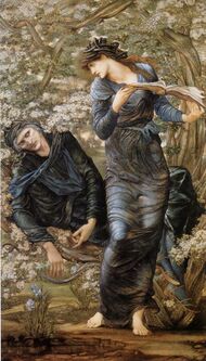 Viviane's character in relation to Merlin is first found in the Lancelot-Grail cycle, after having been inserted into the legend of Merlin by either de Boron or his continuator. There are many different versions of their story. Common themes in most of them include Merlin actually having the prior prophetic knowledge of her plot against him (one exception is the Spanish Post-Vulgate Baladro where his foresight ability is explicitly dampened by sexual desire[77]) but lacking either ability or will to counteract it in any way, along with her using one of his own spells to get rid of him. Usually (including in Le Morte d'Arthur), having learned everything she could from him, Viviane will then also replace the eliminated Merlin within the story, taking up his role as Arthur's adviser and court mage.[82] However, Merlin's fate of either demise or eternal imprisonment, along with his destroyer or captor's motivation (from her fear of Merlin and protecting her own virginity, to her jealousy of his relationship with Morgan), is recounted differently in variants of this motif. The exact form of his prison or grave can be also variably a cave, a tree, or hole either within or under a large rock (as in Le Morte d'Arthur where it happens somewhere in Benwick, the kingdom of Lancelot's father[83]), or an invisible tower of only magic with no physical walls.[48][84] The scene is often placed in the enchanted forest of Brocéliande, a legendary location today identified with the real-life Paimpont forest in Brittany.[85] A Breton tradition cited by Roger Sherman Loomis in Celtic Myth and Arthurian Romance (also asserting there that it "seems almost certain that Morgan le Fay and the Lady of the Lake were originally the same person" in the legend) has Merlin trapped by his mistress inside a tree on the Île de Sein.