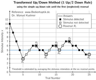 This is the most commonly used non-median UDD. It was introduced by Wetherill in 1963,[14] and proliferated by him and colleagues shortly thereafter to psychophysics,[15] where it remains one of the standard methods to find sensory thresholds.[8] Wetherill called it "transformed" UDD; Misrak Gezmu who was the first to analyze its random-walk properties, called it "Geometric" UDD in the 1990s;[16] and in the 2000s the more straightforward name "[math]\displaystyle{ k }[/math]-in-a-row" UDD was adopted.[11] The design's rules are deceptively simple: