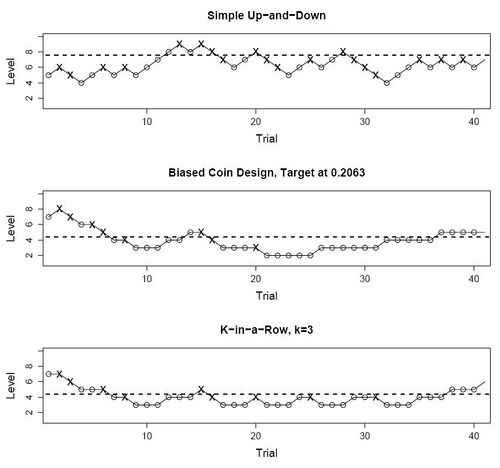 [math]\displaystyle{ k }[/math]-in-a-row is often considered for clinical trials targeting a low-toxicity dose. In this case, the balance point and the target are not identical; rather, [math]\displaystyle{ k }[/math] is chosen to aim close to the target rate, e.g., [math]\displaystyle{ k=2 }[/math] for studies targeting the 30th percentile, and [math]\displaystyle{ k=3 }[/math] for studies targeting the 20th percentile.