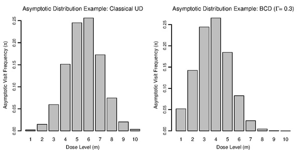 Since UDD random walks are regular Markov chains, they generate a stationary distribution of dose allocations, [math]\displaystyle{ \pi }[/math], once the effect of the manually-chosen starting dose wears off. This means, long-term visit frequencies to the various doses will approximate a steady state described by [math]\displaystyle{ \pi }[/math]. According to Markov chain theory the starting-dose effect wears off rather quickly, at a geometric rate.[12] Numerical studies suggest that it would typically take between [math]\displaystyle{ 2/M }[/math] and [math]\displaystyle{ 4/M }[/math] subjects for the effect to wear off nearly completely.[11] [math]\displaystyle{ \pi }[/math] is also the asymptotic distribution of cumulative dose allocations.