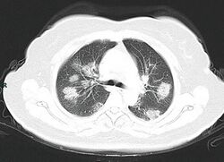 Chest CT scans may be helpful to diagnose COVID‑19 in individuals with a high clinical suspicion of infection but are not recommended for routine screening.[129][141] Bilateral multilobar ground-glass opacities with a peripheral, asymmetric, and posterior distribution are common in early infection.[129][142] Subpleural dominance, crazy paving (lobular septal thickening with variable alveolar filling), and consolidation may appear as the disease progresses.[129][143] Characteristic imaging features on chest radiographs and computed tomography (CT) of people who are symptomatic include asymmetric peripheral ground-glass opacities without pleural effusions.[144]
