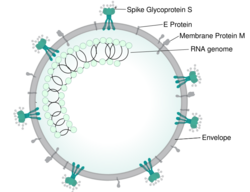 SARS-CoV-2 is closely related to the original SARS-CoV.[62] It is thought to have an animal (zoonotic) origin. Genetic analysis has revealed that the coronavirus genetically clusters with the genus Betacoronavirus, in subgenus Sarbecovirus (lineage B) together with two bat-derived strains. It is 96% identical at the whole genome level to other bat coronavirus samples (BatCov RaTG13).[63][64][65] The structural proteins of SARS-CoV-2 include membrane glycoprotein (M), envelope protein (E), nucleocapsid protein (N), and the spike protein (S). The M protein of SARS-CoV-2 is about 98% similar to the M protein of bat SARS-CoV, maintains around 98% homology with pangolin SARS-CoV, and has 90% homology with the M protein of SARS-CoV; whereas, the similarity is only around 38% with the M protein of MERS-CoV.[66]