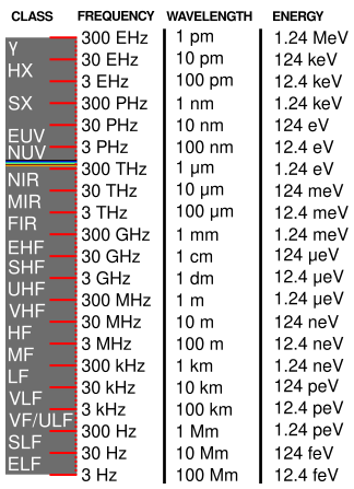 EM radiation (the designation 'radiation' excludes static electric and magnetic and near fields) is classified by wavelength into radio, microwave, infrared, visible, ultraviolet, X-rays and gamma rays. Arbitrary electromagnetic waves can be expressed by Fourier analysis in terms of sinusoidal waves (monochromatic radiation), which in turn can each be classified into these regions of the EMR spectrum.