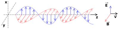 Thus, [math]\displaystyle{ \mathbf{E} \cdot \hat{\mathbf{k}} = 0 }[/math] which implies that the electric field is orthogonal to the direction the wave propagates. The second of Maxwell's equations yields the magnetic field, namely, [math]\displaystyle{ \nabla \times \mathbf{E} = \hat{\mathbf{k}} \times \mathbf{E}_0 f'{\left( \hat{\mathbf{k}} \cdot \mathbf{x} - c_0 t \right)} = -\frac{\partial \mathbf{B}}{\partial t} }[/math]