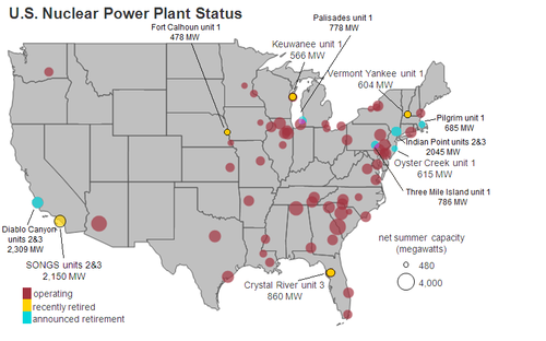 Now, of course, new reactors are more efficient and safer than their predecessors. What these people do not know is that nuclear recycling and reducing nuclear wastes are real possibilities, actively pursued by multiple countries, including the United States, at the moment. Indeed, the U.S. could power itself for the next thousands of years using just the uranium it has already mined.[38][39] Meanwhile, researchers and engineers continue to work on ever safer and more efficient designs for nuclear power plants, sometimes even testing completely new concepts. These could potentially replace the 100 nuclear power plants currently operational in the U.S., but which are scheduled for retirement in the 2030s. Completely replacing them with renewable energy instead may not be a workable strategy.[40] Unlike nuclear energy, which is stable and efficient, the most popular forms of renewable energy, wind and solar, are inherently intermittent. The missing ingredient is thus a high-capacity and durable means of storing the electrical energy generated but not used. Unfortunately, the commonly used lithium-ion battery degrades far too quickly to be economically used for such large scales. Something better is in order.[41] Until the suitable battery technologies become commercially available and possibly even after that, nuclear energy continues to have an important role to play in the shift away from fossil fuels, especially at a time when demand for energy is on the rise. In fact, due to growing awareness of the need to reduce greenhouse emissions and the promise of nuclear power, many young engineers and entrepreneurs nationwide are working on the next generation of nuclear reactors, collectively known as Generation IV reactors. Some of these might be able to run on depleted uranium, (low-level radioactive) leftovers from the uranium enrichment process.[note 11] At present, the Paducah Gaseous Diffusion Plant in Kentucky, home to the biggest deposit of depleted uranium in the entire United States, has enough of this material to power the entire country for 750 years.[40] Nuclear power is thus practically renewable. After decades of a "nuclear winter" for the industry, a nuclear renaissance is just around the corner.[40] It is unwise to throw away this opportunity because of anti-nuclear hysteria or because of falling oil prices.