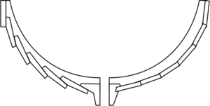In building a simple pulling boat, workers assemble and securely set up the keel, hog, stem, apron, deadwoods, sternpost and perhaps transom.[lower-alpha 2] In normal practice, this will be the same way up as they will be in use. From the hog, the garboard, bottom, bilge, topside and sheer strakes are planked up, held together along their ‘lands’ – the areas of overlap between neighbouring strakes – by copper rivets. At the stem and, in a double-ended boat, the sternpost, geralds are formed. That is, in each case, the land of the lower strake is tapered to a feather edge at the end of the strake where it meets the stem or stern-post. This allows the end of the strake to be screwed to the apron with the outside of the planking mutually flush at that point and flush with the stem. This means that the boat's passage through the water will not tend to lift the ends of the planking away from the stem. Before the next plank is laid up, the face of the land on the lower strake is bevelled to suit the angle at which the next strake will lie in relation with it. This varies all along the land. Gripes are used to hold the new strake in position on the preceding one before the fastening is done.