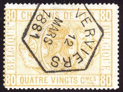 A Belgian railway parcel stamp from the 1879-82 series used in 1881 at Verviers.