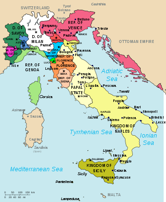 During the 1450s and 1460s, the Republic became a pawn in the struggle between France and Aragon for power and influence in Italy.[19] Threatened by Alfonso V of Aragon, the Doge of Genoa in 1458 handed the Republic over to the French, becoming the Duchy of Genoa under the control of a French royal governor, John of Anjou. However, with support from Milan, Genoa revolted and the Republic was restored in 1461. The Milanese then changed sides, conquering Genoa in 1464 and holding it as a fief of the French crown.[20][21][22] Christopher Columbus was born in Genoa during this period, but sought a career elsewhere. Genoa was ultimately occupied by the French or the Milanese for much of the period. From 1499 to 1528, the Republic reached its nadir, being under nearly continual French occupation. The Spanish, with their intramural allies, the "old nobility" entrenched in the mountain fastnesses behind Genoa, captured the city on May 30, 1522, and subjected the city to a merciless pillage. When the great admiral Andrea Doria of the powerful Doria family allied with the Emperor Charles V to oust the French and restore Genoa's independence, a renewed prospect opened: 1528 marks the first loan from Genovese banks to Charles.[23]