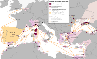 In 1255 Genoa established the colony of Caffa in Crimea.[4] In the following years the Genoese established further colonies in Crimea: Soldaia, Cherco and Cembalo.[4] In 1275 the Byzantine Empire granted the islands of Chios and Samos to Genoa.[4]